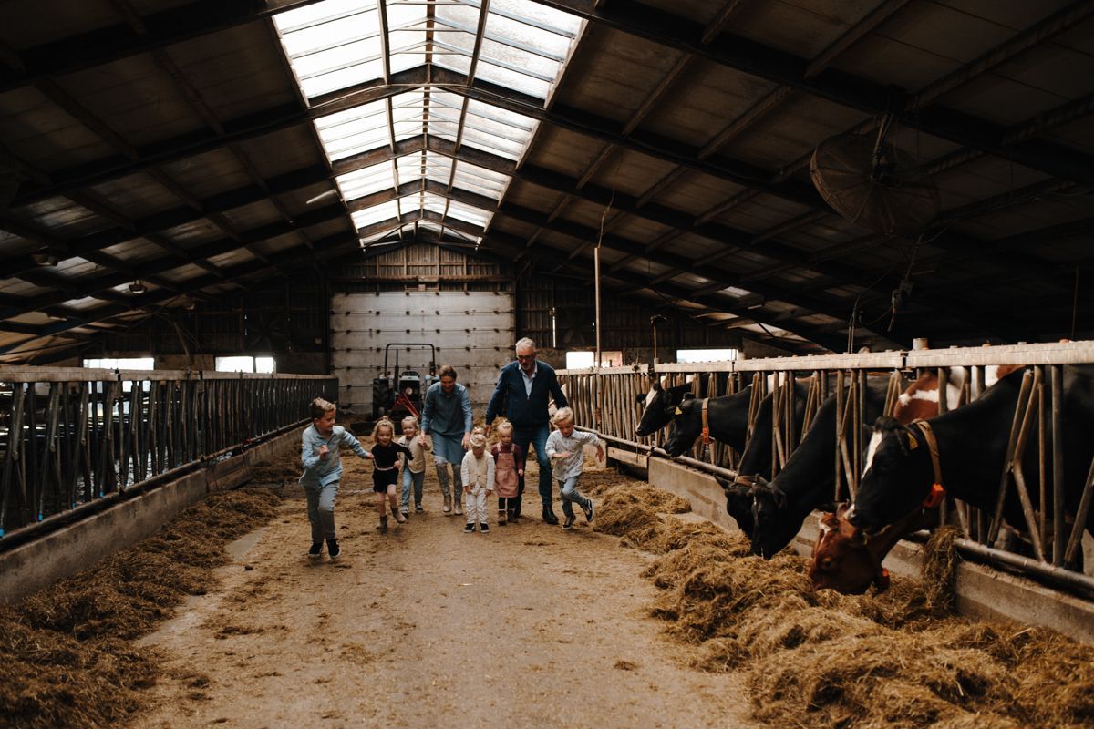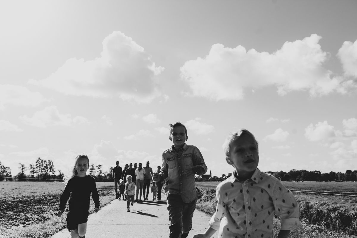 Tijdens de shoot neem ik de regie waar nodig, maar laat ik ook ruimte. We fotograferen buiten, vaak in de natuur van Friesland. Dat geeft rust en bewegingsvrijheid. Kinderen mogen spelen en voel je ook vrij om lekker even een bal mee te nemen. Ik geef duidelijke, eenvoudige aanwijzingen en kijk steeds naar wat er gebeurt in de groep.