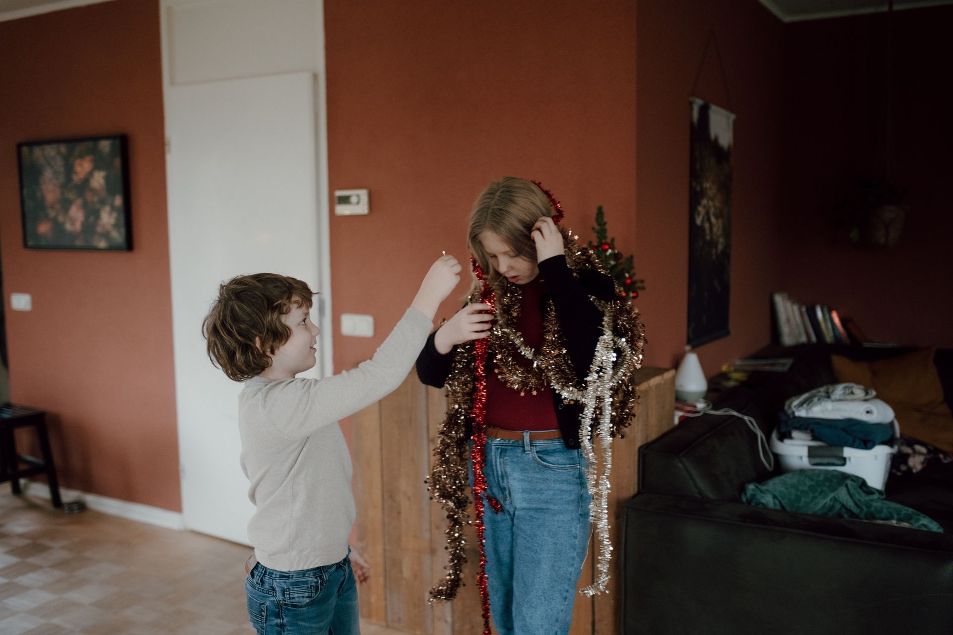 Geen geposeerde momenten, maar foto's die de natuurlijke interactie en sfeer vastleggen. De focus ligt op de echte emoties en spontane reacties van het gezin tijdens het optuigen van de kerstboom, wat zorgt voor oprechte en levendige beelden.